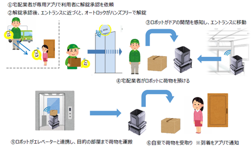 スマホ1つで自動ドア、エレベーター、ロボットが連携!荷物を自室まで自動配送する宅配業務支援の実証実験を実施しました。